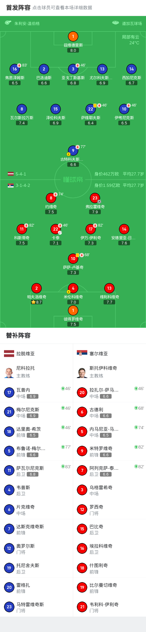 塞尔维亚1-0拉脱维亚,弗拉霍维奇一锤定音 2025-09-18 04:00:36 意甲 106℃ 0 北京时间9月6日世界杯欧洲区预选赛 第一阶段小组赛 第5轮,拉脱维亚对阵塞尔维亚。塞尔维亚弗拉霍维奇破门。最终比分拉脱维亚 0-1 塞尔维亚。精彩瞬间第12分钟,塞尔维亚球员卡泰助攻弗拉霍维奇打入一球。球队阵容技术统计 上一篇:真的吗?利拉德:我没过夺冠是因为碰上了勇士王朝 相关推荐 塞尔维亚1-0拉脱维亚,弗拉霍维奇一锤定音 真的吗?利拉德:我没过夺冠是因为碰上了勇士王朝 山西vs青岛战况:赵嘉义20分焦海龙16分 青岛力克山西 智利甲比赛前瞻:奥伊金斯vs科布雷萨尔预测分析(2025年08月17日)